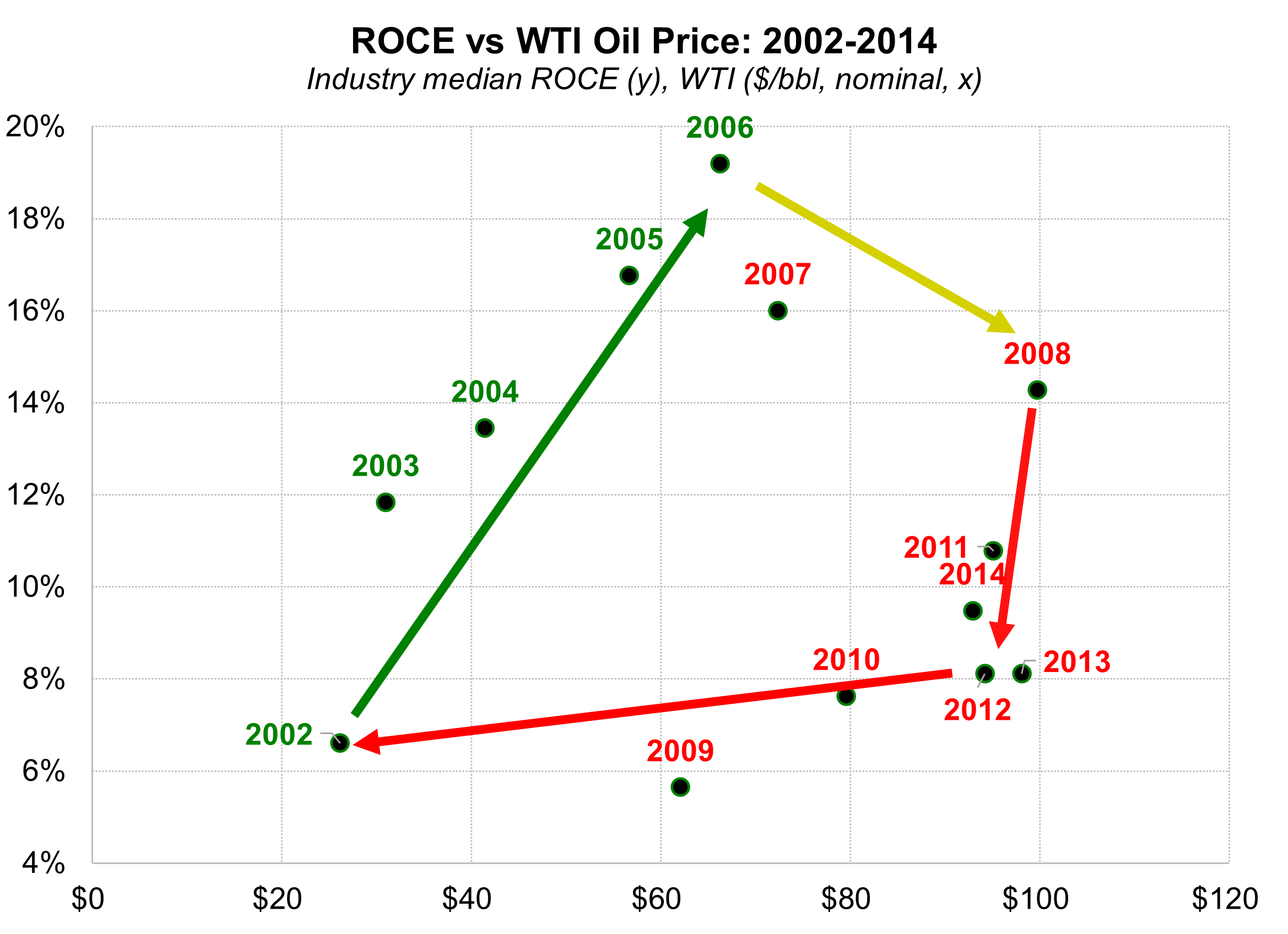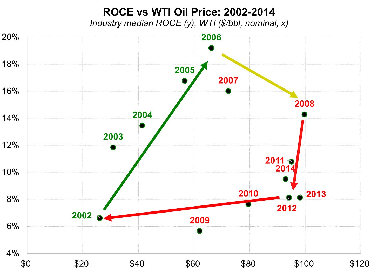 We have written extensively about challenges in execution in the oil & gas space during the “Super-Spike” era of 2004-2014 using our “Quadrilateral of Death” framework (Exhibit 3). We observed that the erosion in the relationship between WTI oil prices and corporate ROCE (return on capital employed) was the warning sign that the oil cycle was long in the tooth from a value creation perspective. Given the very different nature of power markets versus crude oil, we suspect that it won’t be a commodity price versus ROCE metric that will be the early warning sign. We have not yet come up with what the equivalent analogue will be in power and welcome any feedback from those of you with greater expertise in power have.